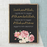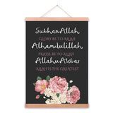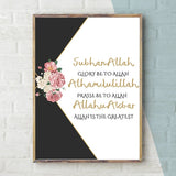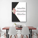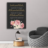 SubhanAllah, Alhamdulilah, and AllahuAkhbar. These three phrases remind us daily of the Glory and Greatness of Allah. This beautiful floral themed Islamic Canvas Art embodies those phrases along with its' English versions. It's a subtle yet power reminder to all of us. Its floral theme fits perfectly within the setting of a bedroom or a kid's room. A great addition to your household decor