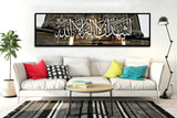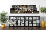 This is a modern minimalistic landscape Islamic Canvas Art utilising beautiful Arabic Calligraphy. It creates a sophisticated style to any living space paired with warm lighting. It makes for a great decorative art piece in the living room or the office. The gold colour against a black background enhances each beautiful stroke of the Arabic Calligraphy