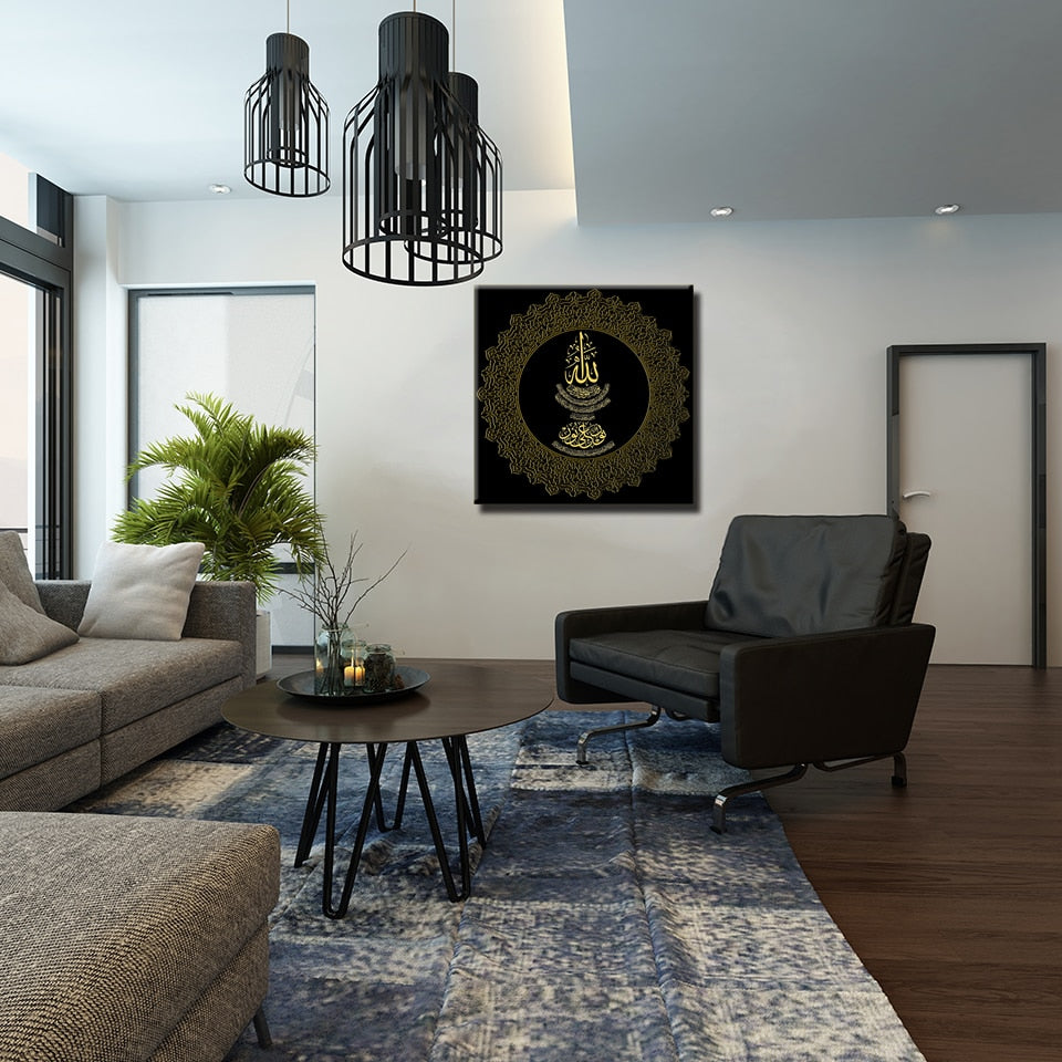 This is a modern minimalistic Islamic Canvas Art utilising beautiful Arabic Calligraphy. It creates a sophisticated style to any living space paired with warm lighting. It makes for a great decorative art piece in the living room or the office. The gold colour against a black background enhances each beautiful stroke of the Arabic Calligraphy
