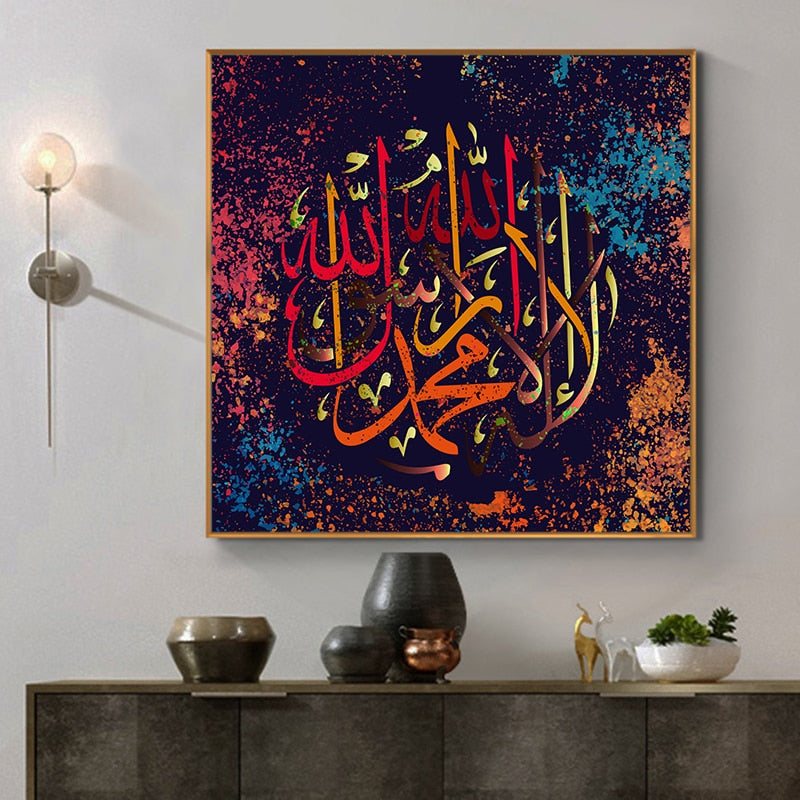 This is a modernistic take on Arabic Calligraphy utilising vibrant colours that really makes it the centre of attention in any living space. It's a fusion of both the ancient art of Arabic Calligraphy and modern art culture. This is one of the more popular pieces amongst young Muslims who embraces their love of Islam. This particular piece comes in a perfect square design